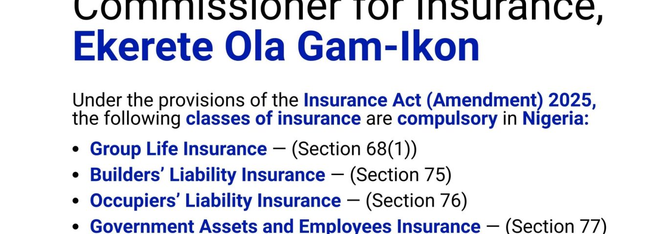 At the 2025 Nigerian Insurance Industry Reform Agenda (#NIIRA2025), the Deputy Commissioner for Insurance, Ekerete Ola Gam-Ikon, unveiled the 11 compulsory classes of insurance now mandated under the Insurance Act (Amendment) 2025.
